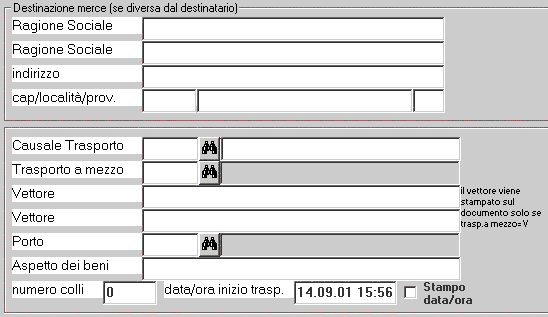 Videata Dati DDT (destinazione, trasporto, colli, ecc...):
