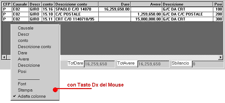 Un click il tasto destro del mouse in qualsiasi punto della griglia fa apparire una menu che permette di riordinare la griglia per una colonna desiderata, stampare la griglia ed altre funzioni.